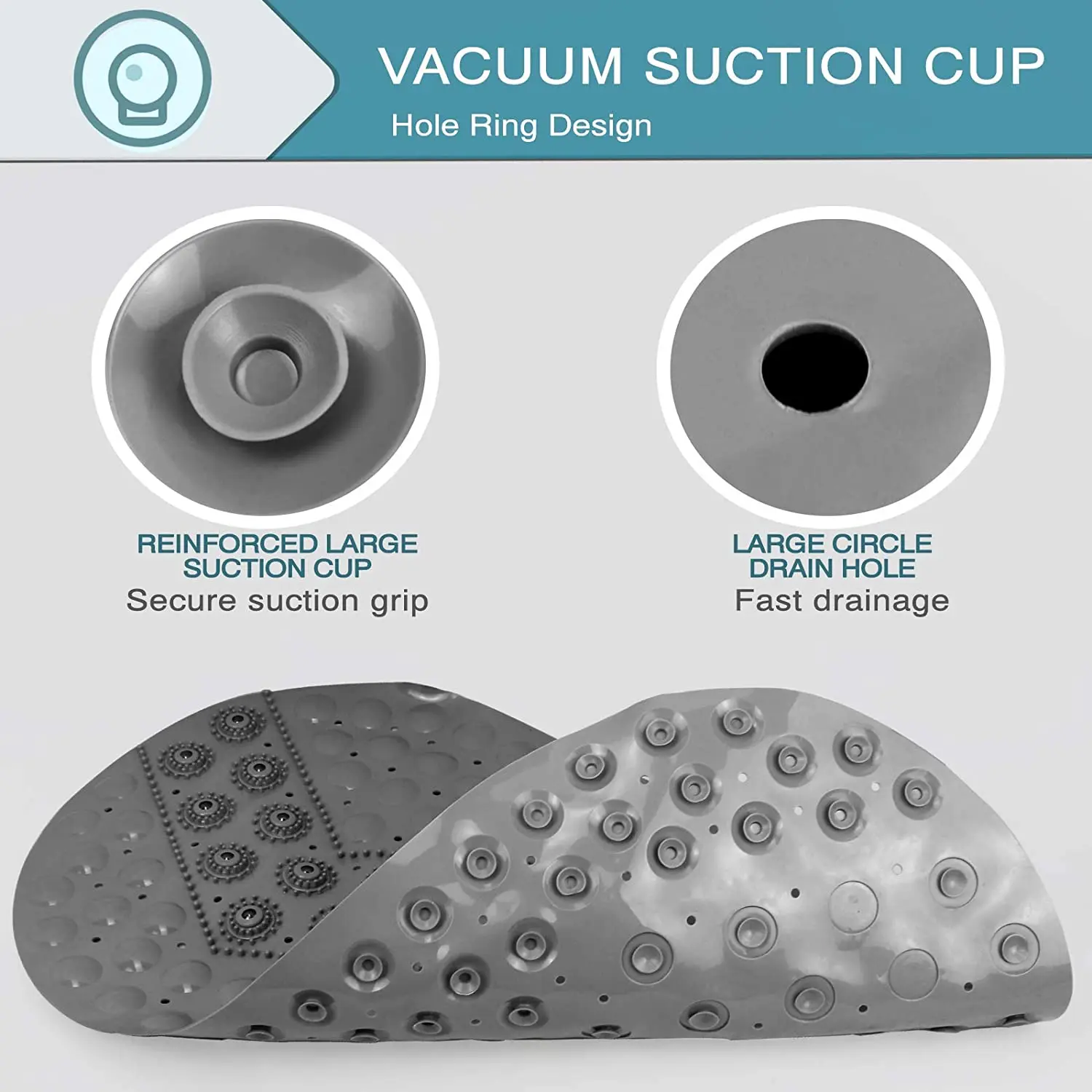 The front of the steady shower mat is covered with round non-slip rings, and the bottom is covered with suction cups.